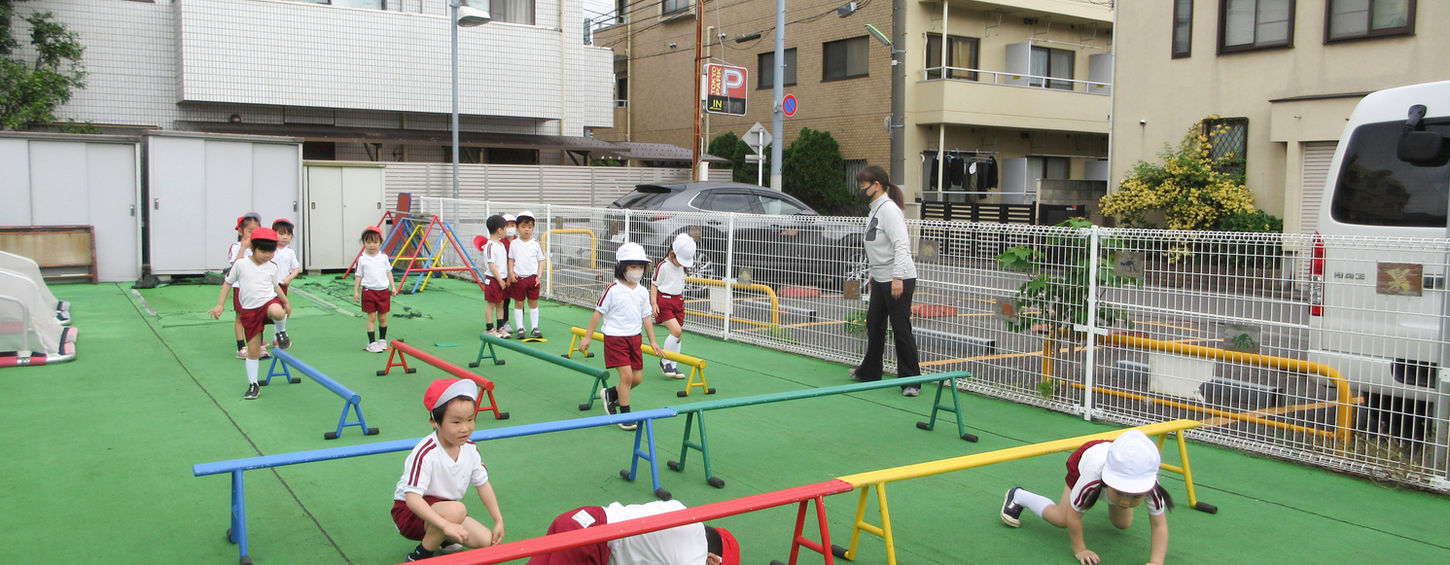 年中2学期から月2回専門の体育講師の指導を受けています。遊びの中から体を動かし